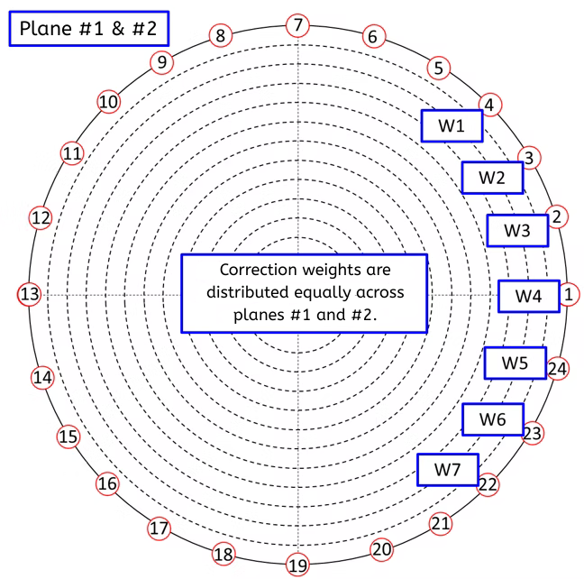- The balancing weights are distributed equally between plane #1 and plane #2 (the front and rear planes of the rotor).
